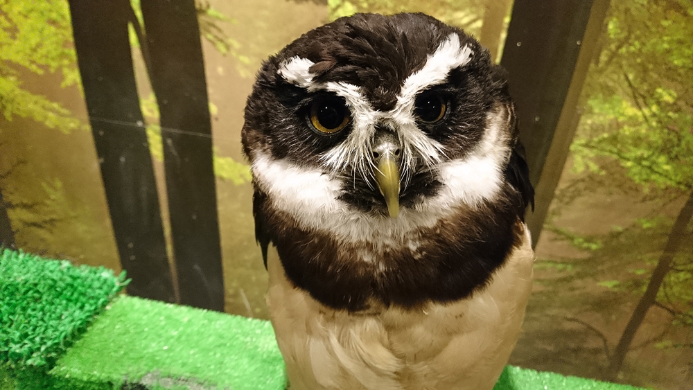 メガネフクロウのミルク。コーヒーにミルクを入れた時の状況に似ているからでしょうか。比較的おとなしい個体で、なでるのには問題ないフクロウでした。