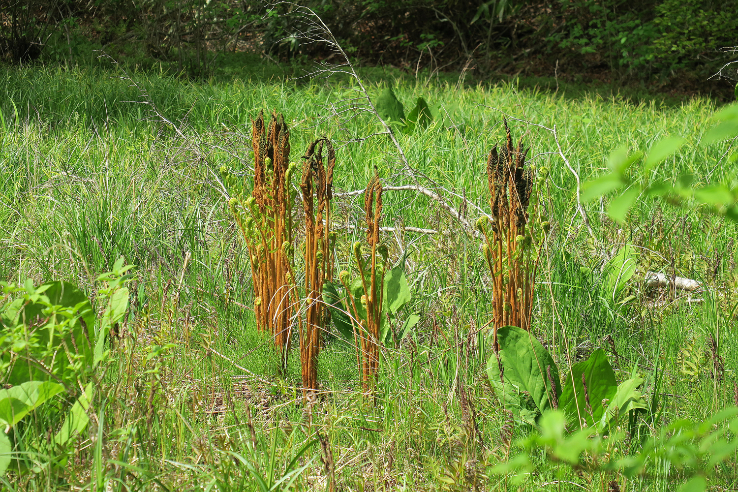 茶色い植物はヤマドリゼンマイ。食べられます。
